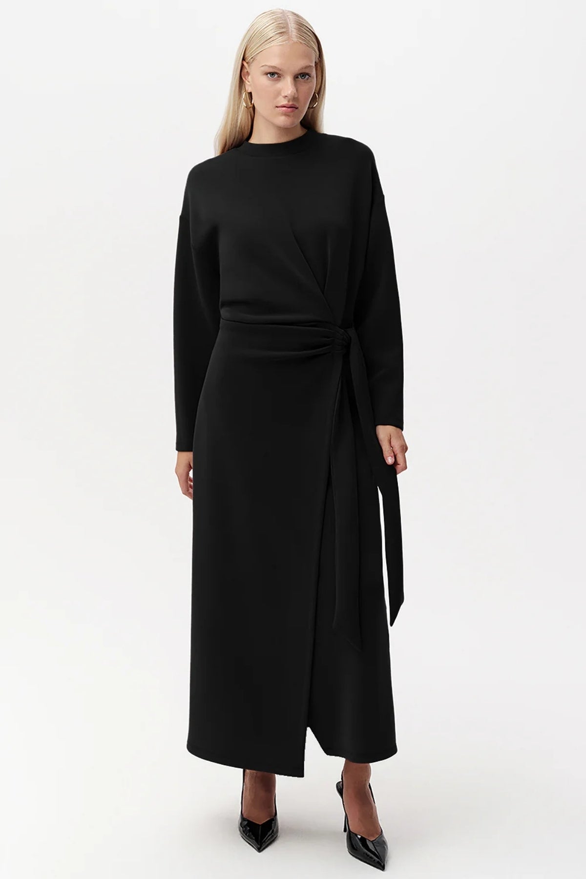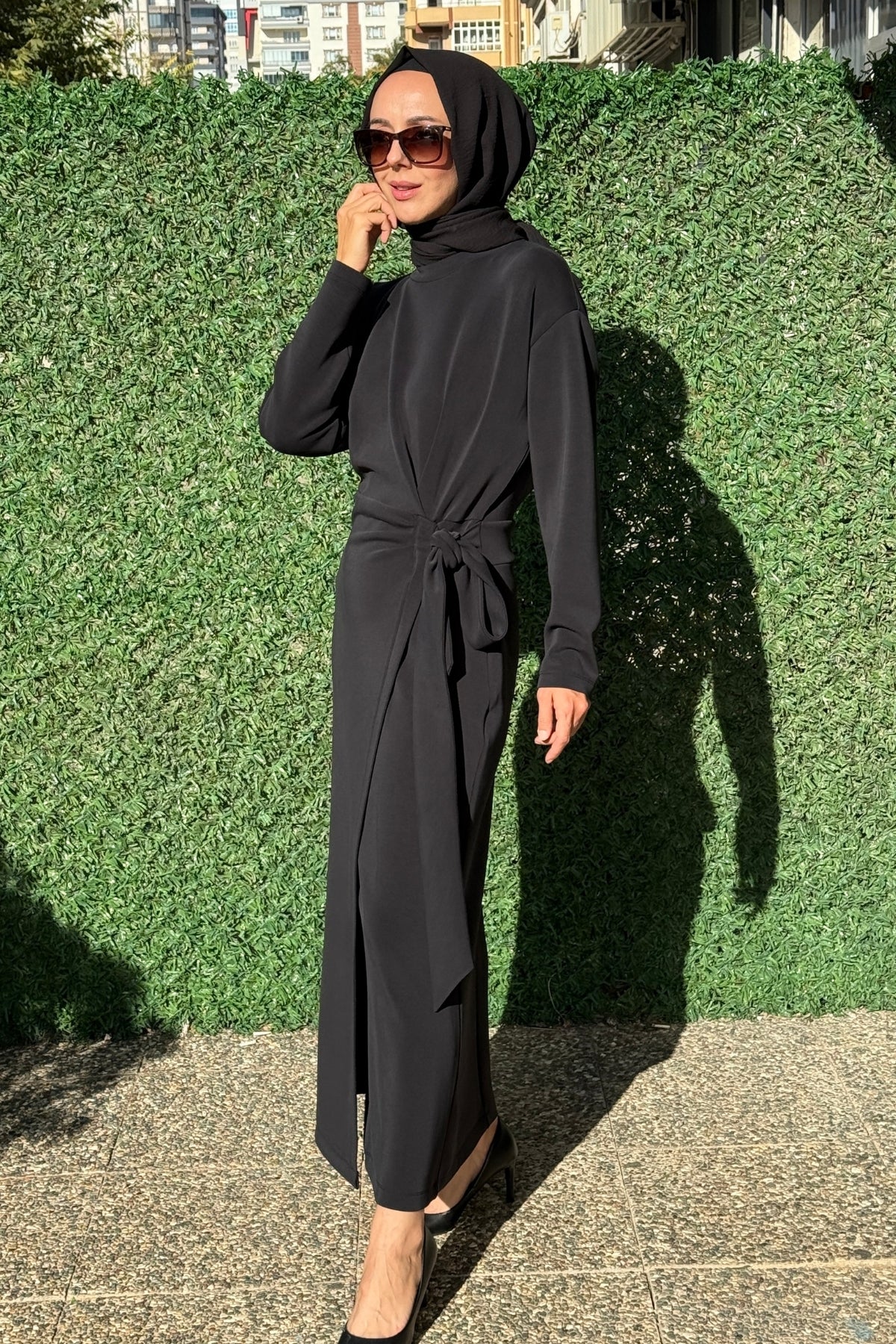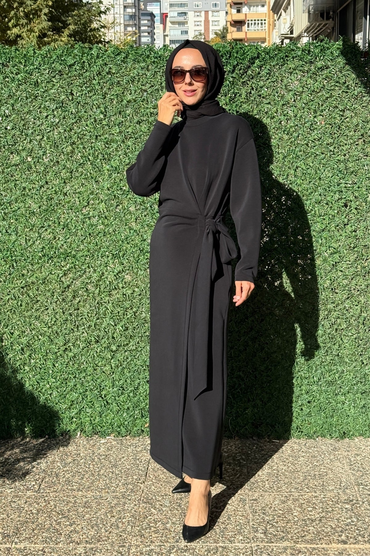 Antrasit renkli, uzun kollu midi boy elbise. Yumuşak dokulu, orta kalınlıkta örme kumaştan üretilmiştir. Bel kısmında yer alan sarmal bağlama detayıyla hem konforlu hem de zarif bir siluet oluşturur. Yuvarlak yaka formu ve düz kesimi sayesinde günlük şıklıkla davet zarafetini birleştirir.