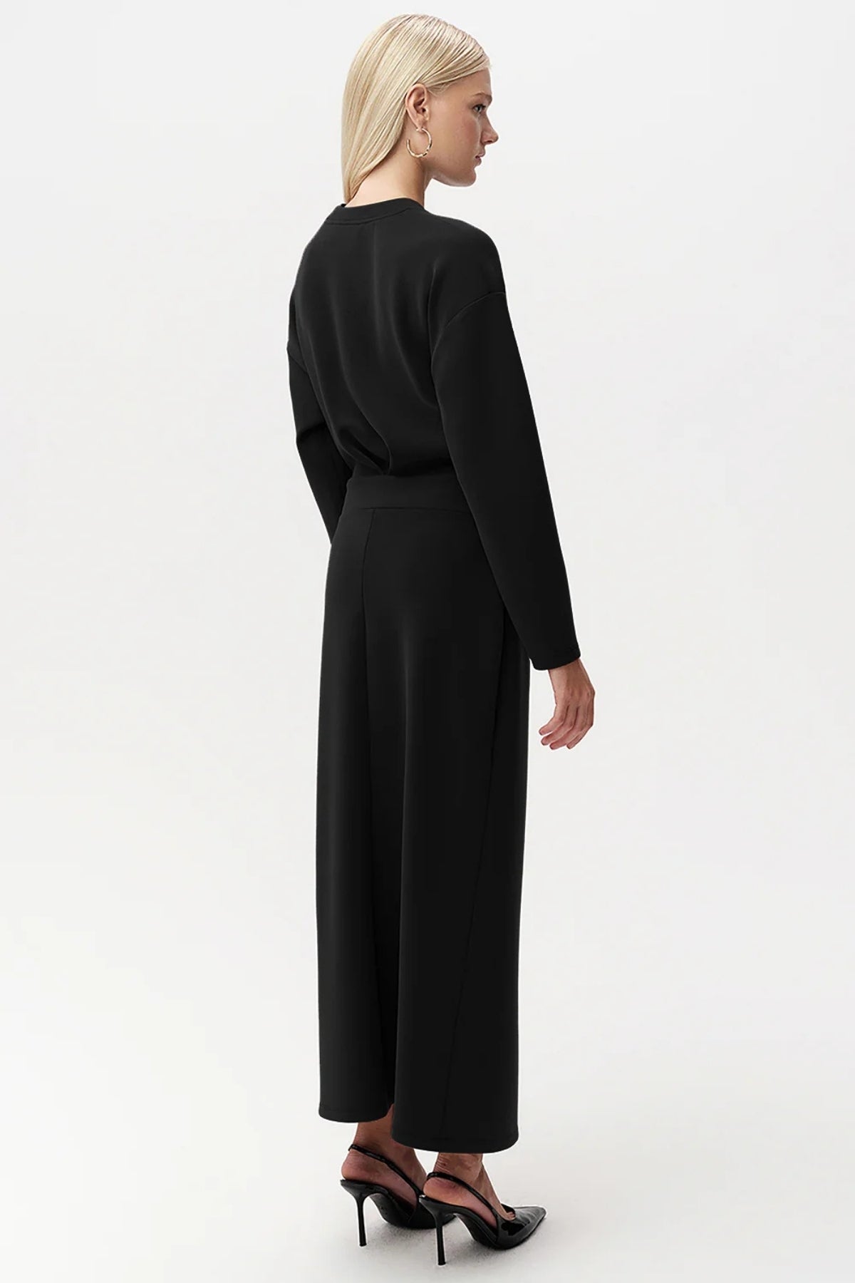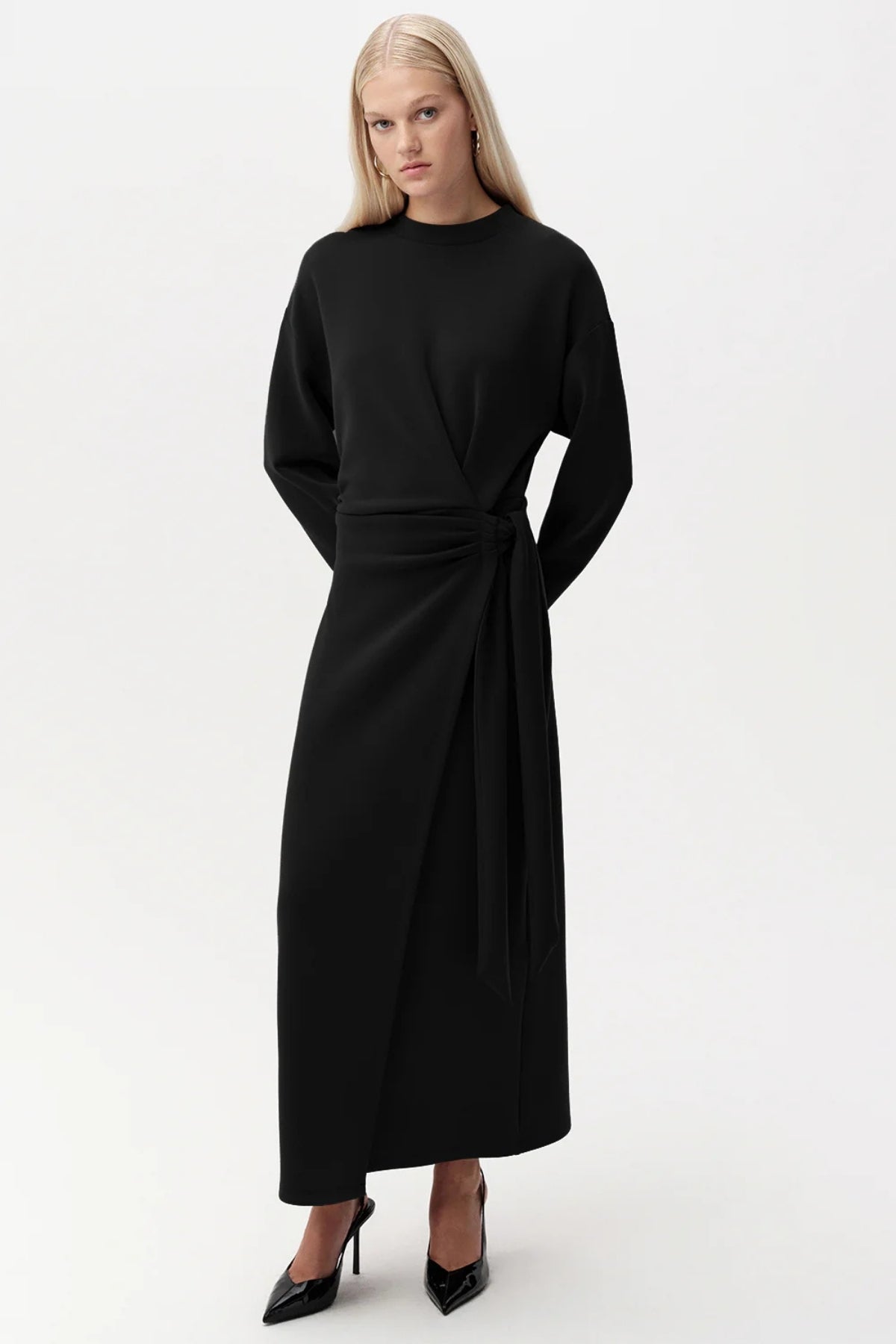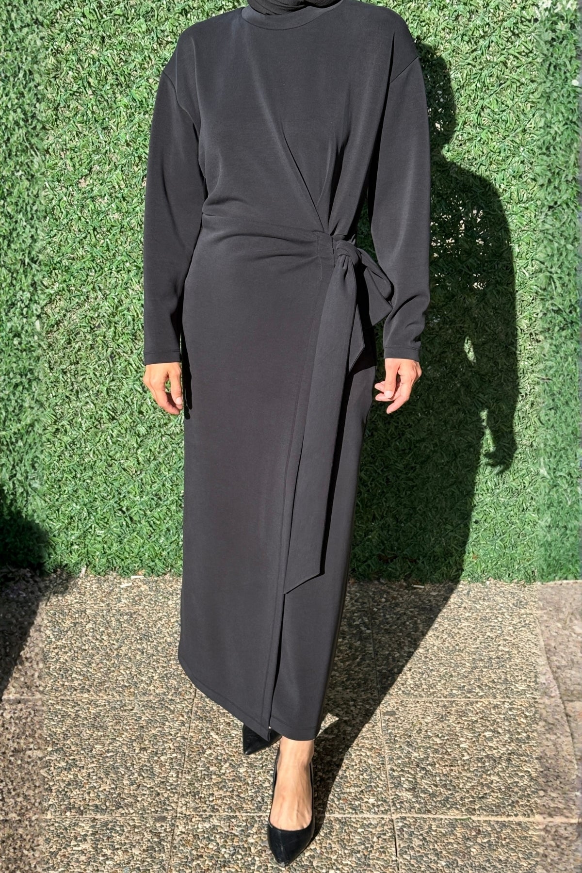 Antrasit renkli, uzun kollu midi boy elbise. Yumuşak dokulu, orta kalınlıkta örme kumaştan üretilmiştir. Bel kısmında yer alan sarmal bağlama detayıyla hem konforlu hem de zarif bir siluet oluşturur. Yuvarlak yaka formu ve düz kesimi sayesinde günlük şıklıkla davet zarafetini birleştirir.