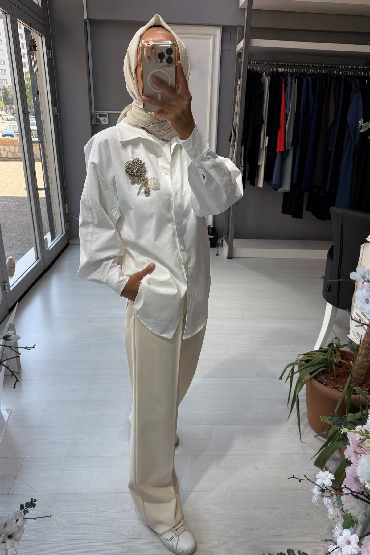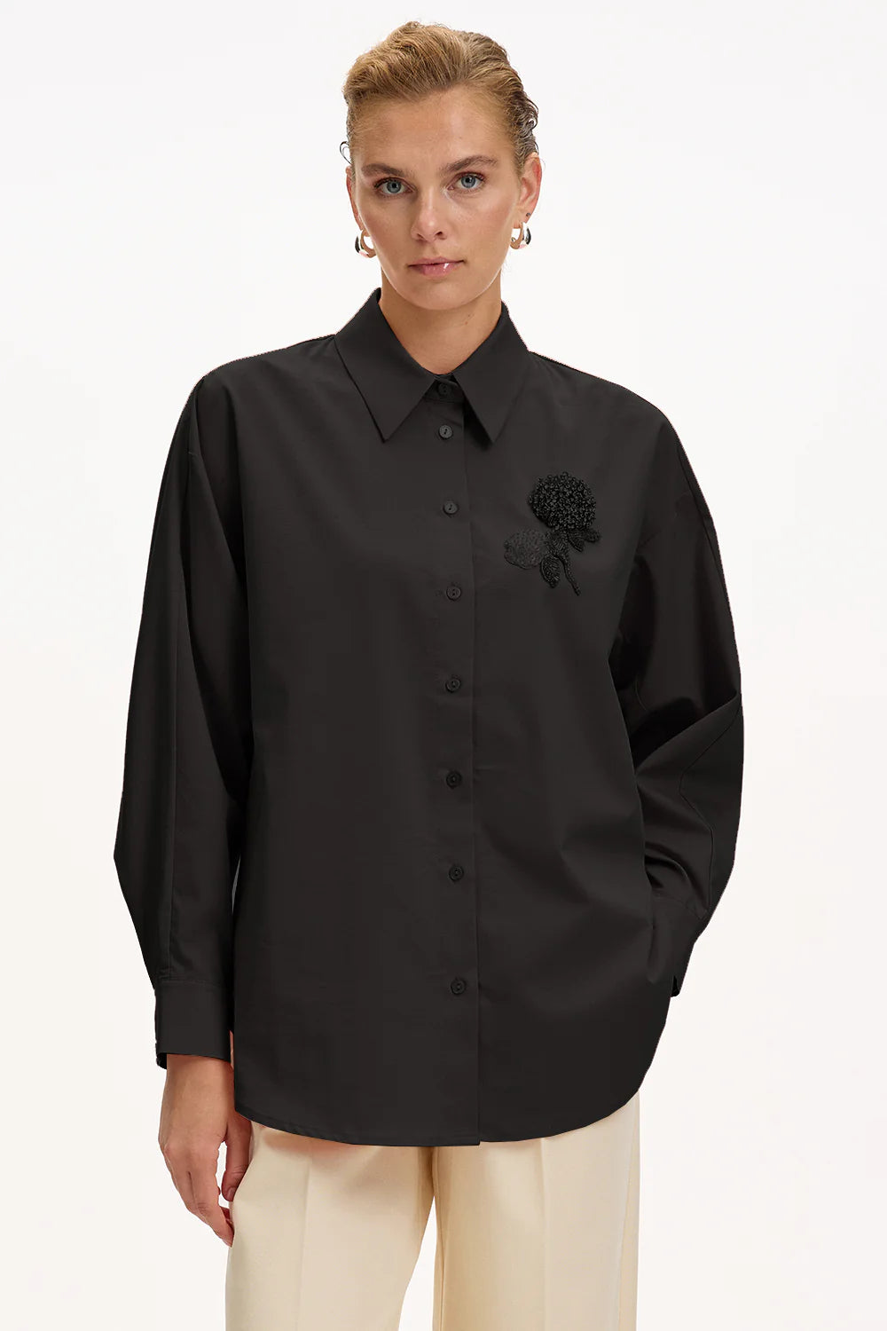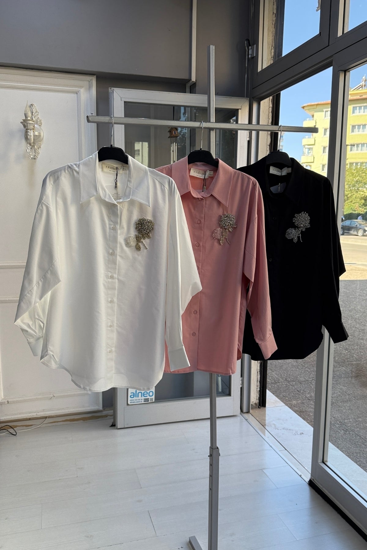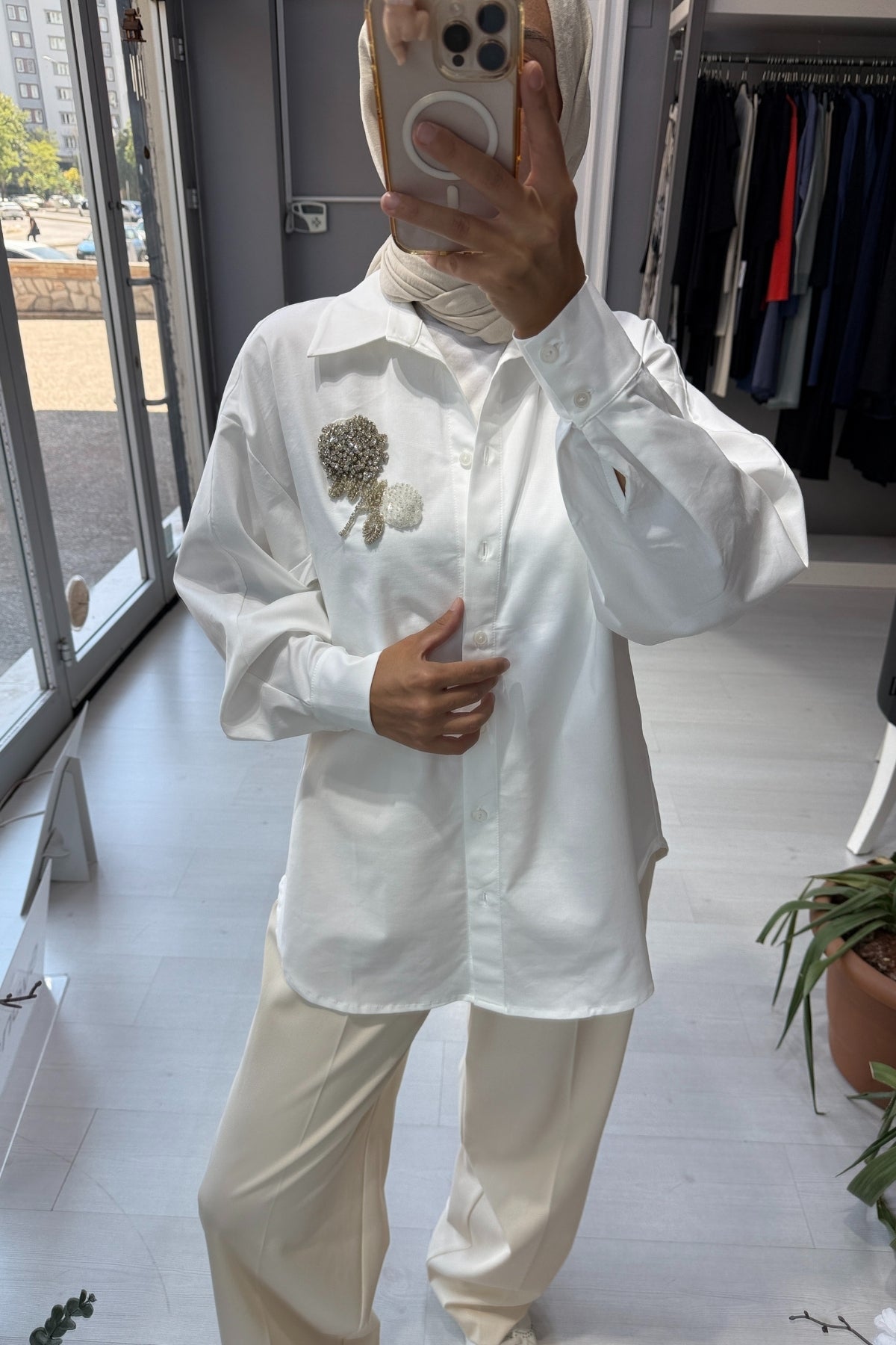 Uzun kollu gömlek, klasik formunu küçük ama etkili bir ayrıntıyla tamamlıyor: sol göğüs kısmındaki taş işlemeli çiçek motifi. Düz kesimiyle rahat bir duruş sunarken,  düğmeleri ve net hatlarıyla zamansız bir görünüm yaratır. Günün her anında, ister ciddi ister rahat kombinlerde yerini kolayca bulur.