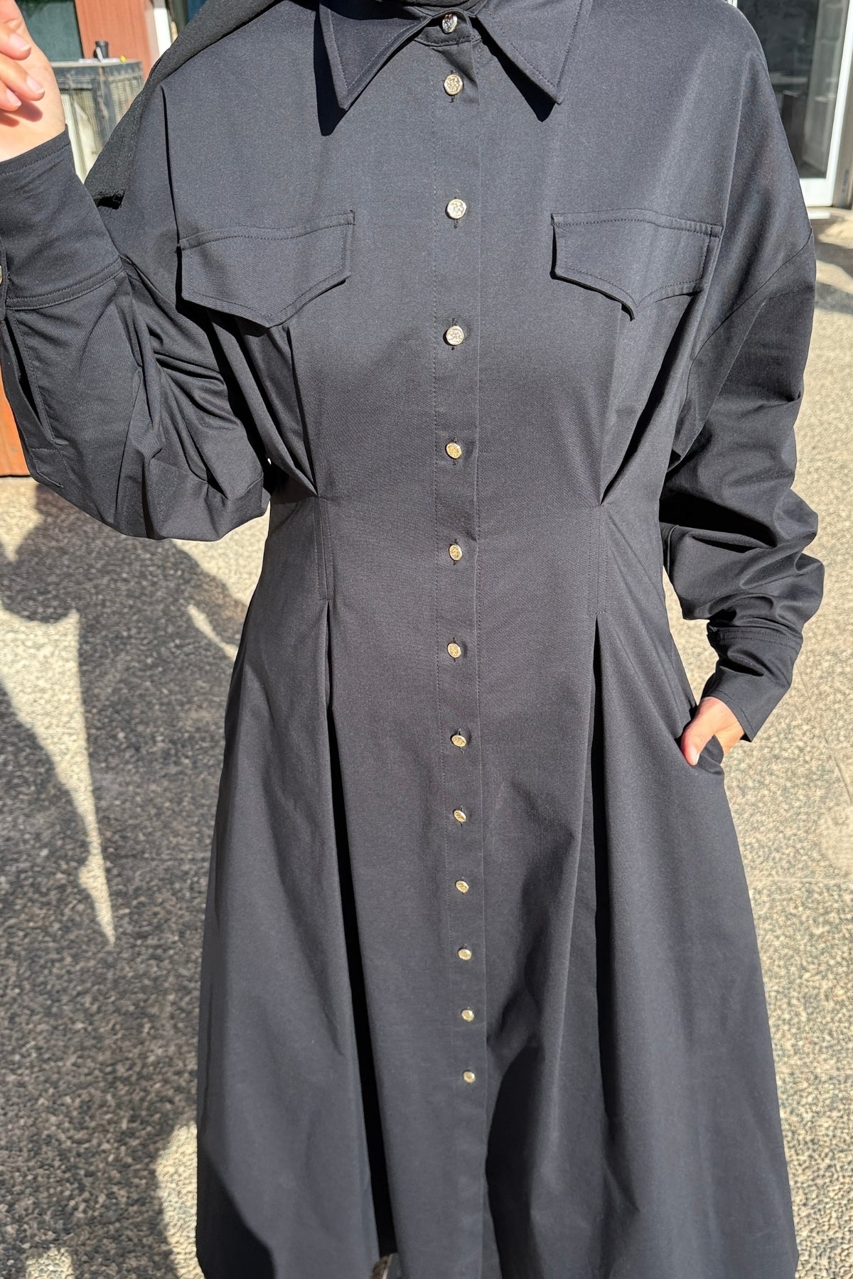 Exquise Gömlek Yaka Uzun Kollu Cepli Regular Düğmeli Midi Elbise