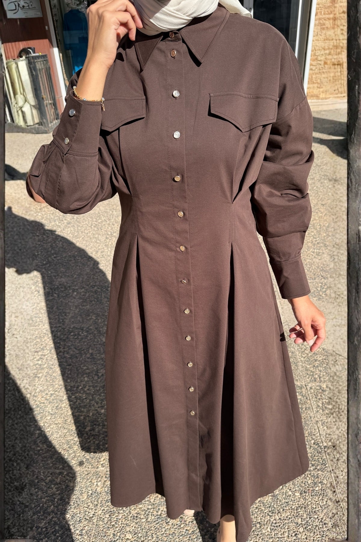 Klasik çizgileriyle dikkat çeken bu kahverengi elbise, tam boy düğme detayları ve göğüs cep tasarımıyla sade ama güçlü bir duruş sunar. Bel kısmındaki dikiş formu vücut hatlarını zarifçe belirginleştirirken, uzun etek kısmı gün boyu rahatlık sağlar. Günlük kombinlerde ya da özel davetlerde modern bir görünüm için idealdir.