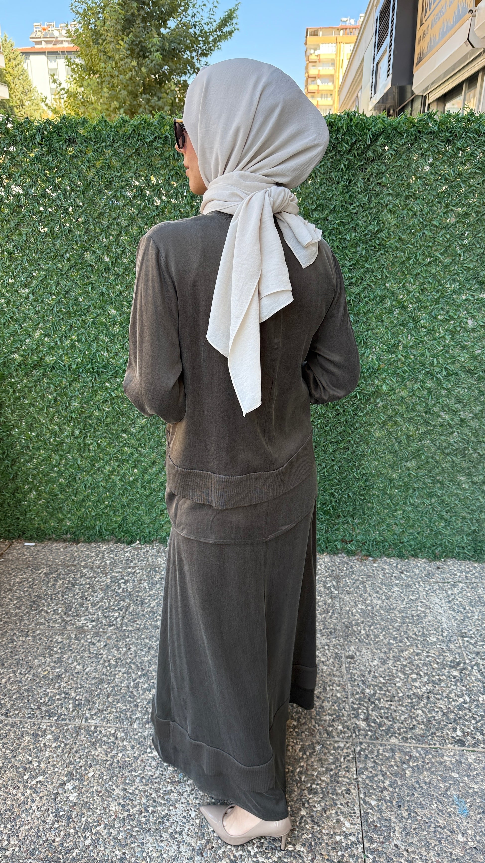 Triko bant detaylı cupro gri etek, modern tasarımı ve zarif dokusuyla her stile uyum sağlar. Cupro kumaşın ipeksi yumuşaklığı, triko bant detayıyla birleşerek eteğe şık bir dinamizm kazandırır. Hem günlük hem özel gün kombinlerinde rahatlıkla kullanılabilecek bu model, Miss Dalida’nın sade ve zarif çizgisini yansıtır.