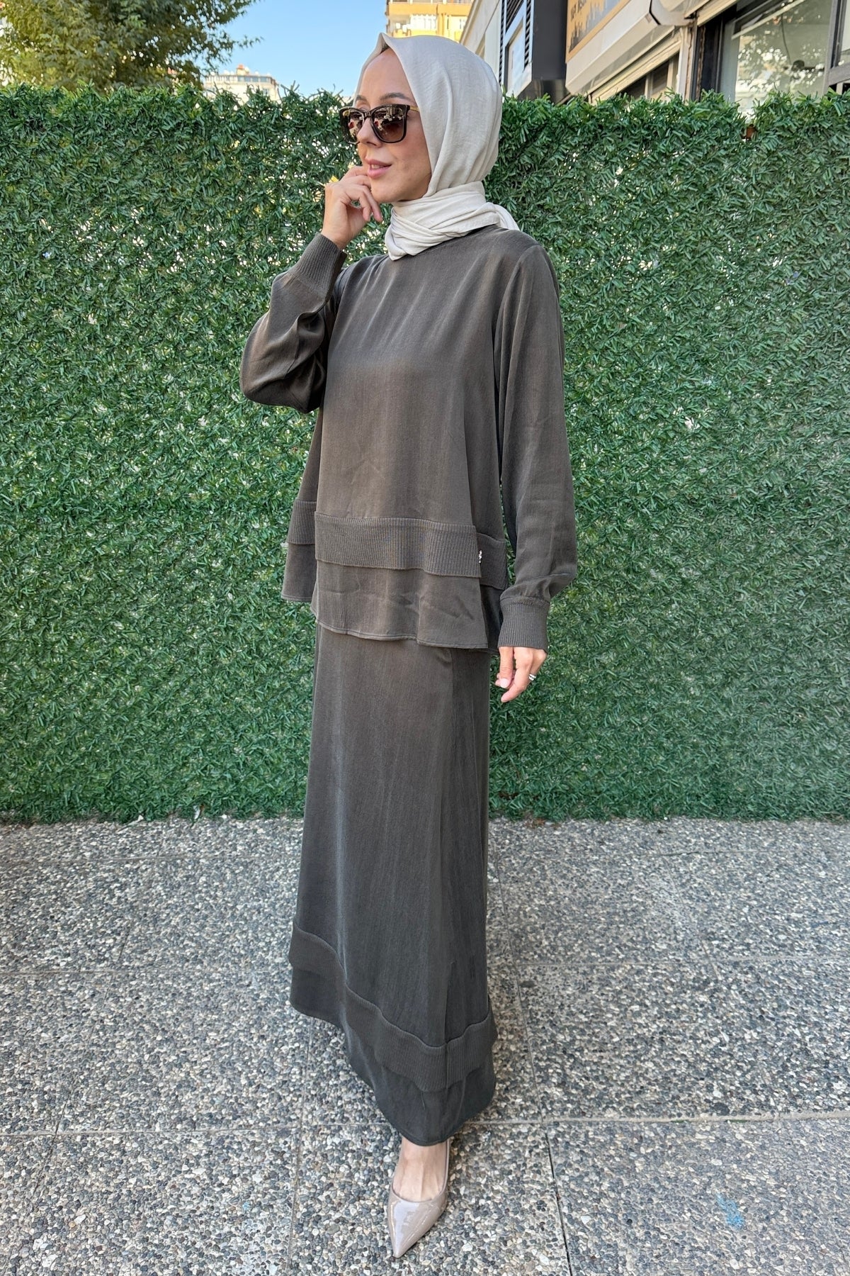 Triko bant detaylı cupro kahverengi tunik, ipeksi cupro dokusu ve dikkat çekici bant detaylarıyla zarif bir duruş sunar. Rahat kesimi sayesinde gün boyu konfor sağlarken, kahverenginin sıcak tonuyla her mevsime uyum sağlar. Gündüzden geceye geçişlerde kolaylıkla kullanılabilecek bu Miss Dalida tasarımı, sade şıklığın en güzel örneklerinden biridir.