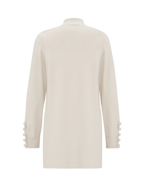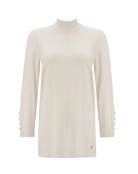 Modern tasarımı ve sade duruşuyla dikkat çeken bu uzun kollu triko tunik, her kombine uyum sağlayan taş rengiyle öne çıkıyor. Yumuşak dokusu, boğazlı yaka kesimi ile soğuk havalarda ideal bir tercih haline geliyor. Kol kısmındaki düğme detayları ise tunik modeline hoş bir dokunuş katıyor.