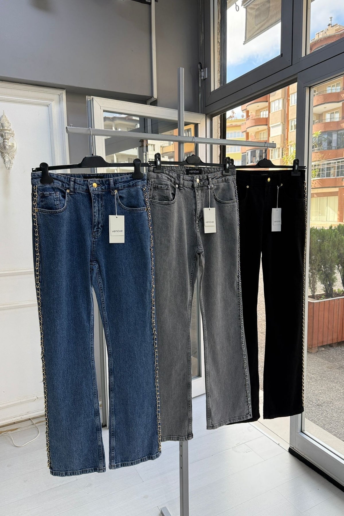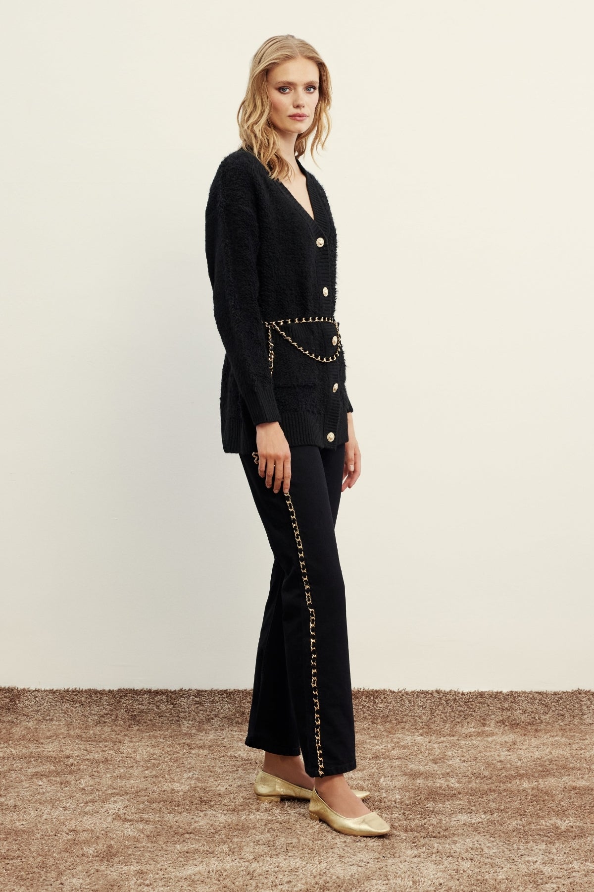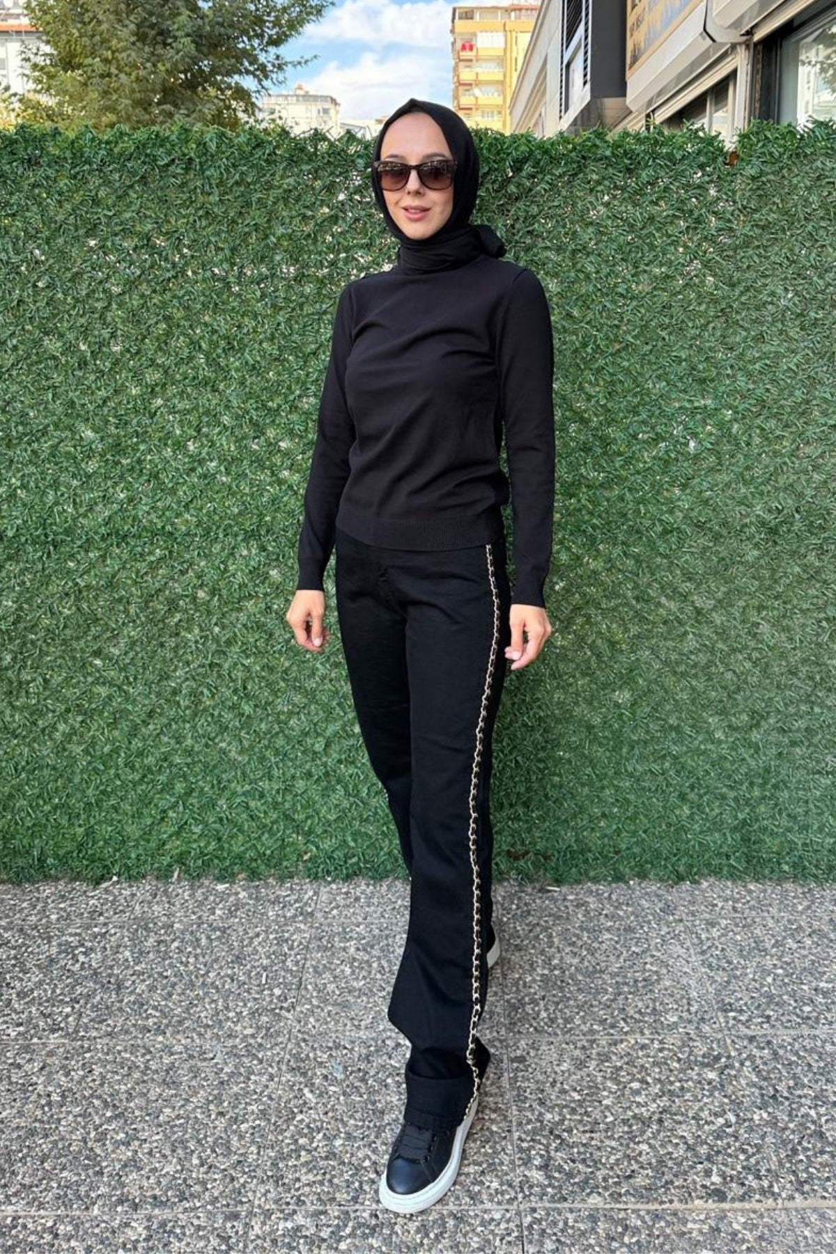 Zincir detaylarıyla modern ve zarif bir görünüm sunan bu pantolon koleksiyonu, klasik kesimiyle hem günlük hem de özel kombinlerinizde şıklığı garanti ediyor. Esnek dokusu ve dikkat çekici yan şerit tasarımıyla vücudu zarifçe sararken, konforu ve stilinizi bir araya getirir. Topuklu botlar ya da düz ayakkabılarla kolayca kombinlenebilir.