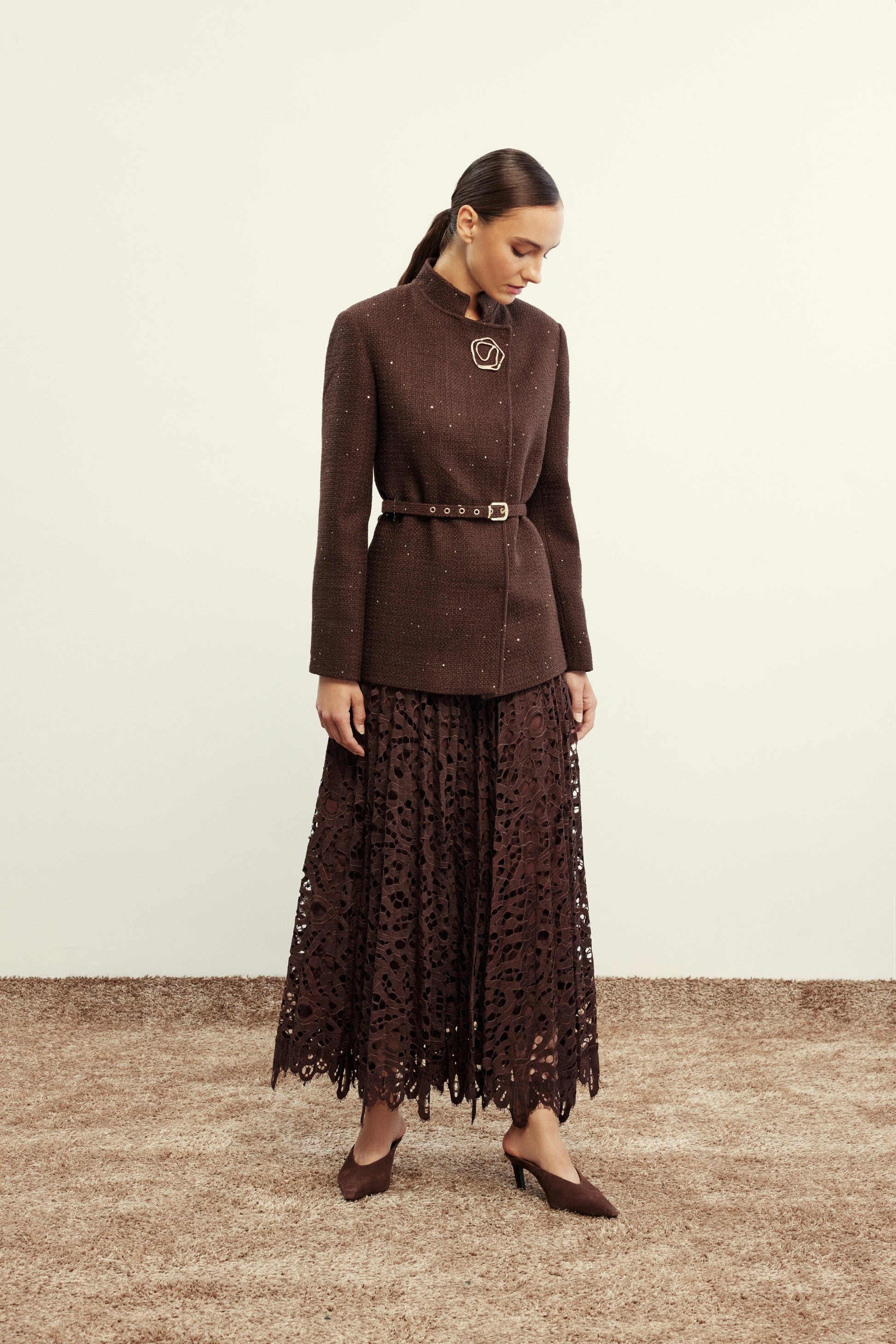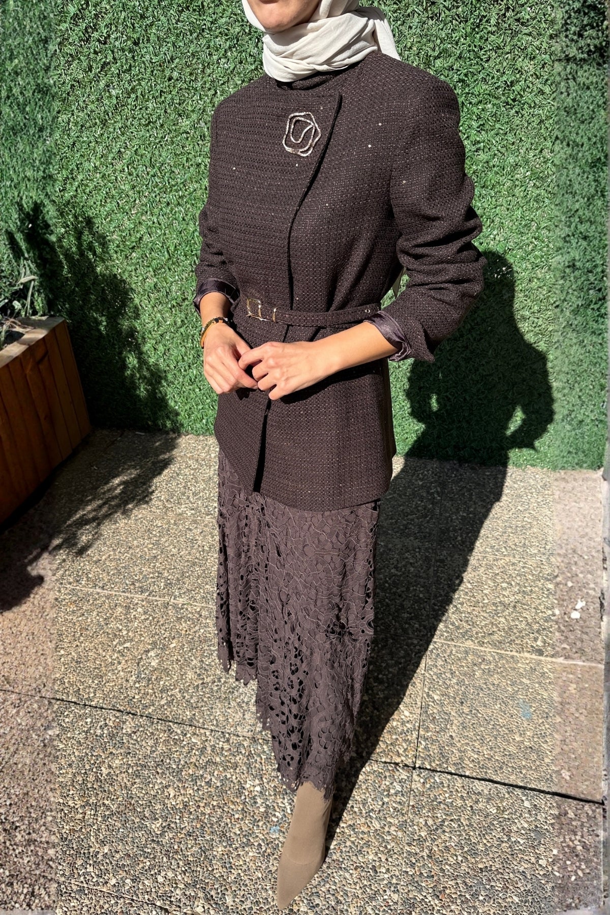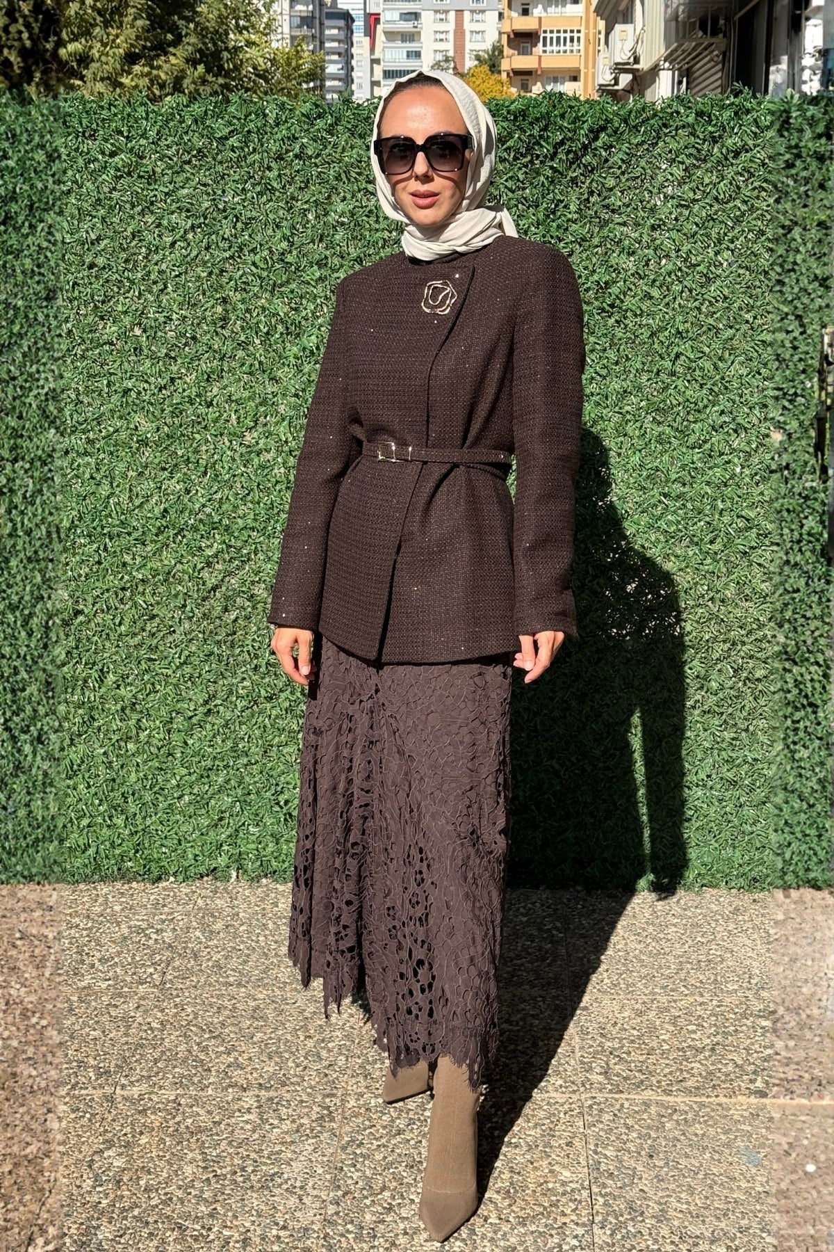 Kahverengi tonlarında, düz kesim ve hakim yaka detaylı ceket. İnce kemerle bel kısmı vurgulanmış, minimal ve zarif bir duruş sunar. Günlük şıklıkta veya özel davetlerde rahatlıkla tercih edilebilir.