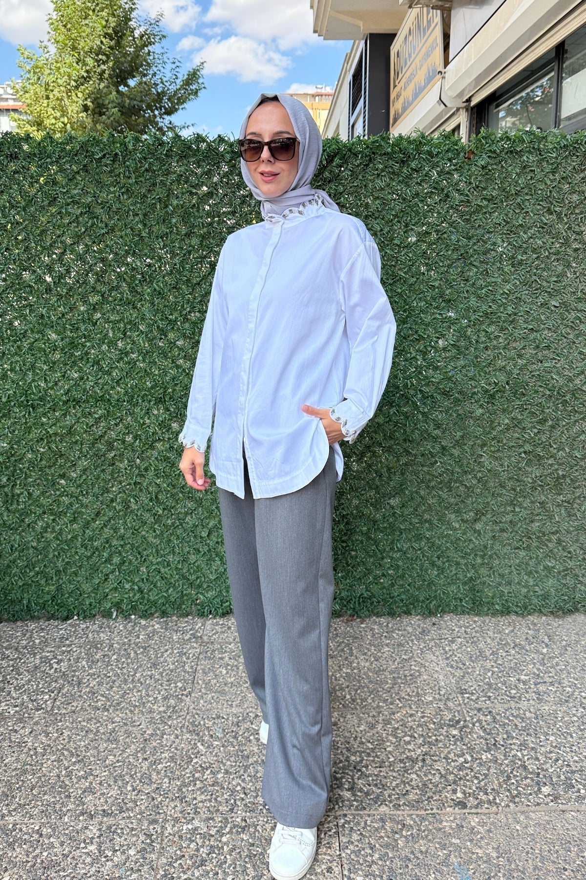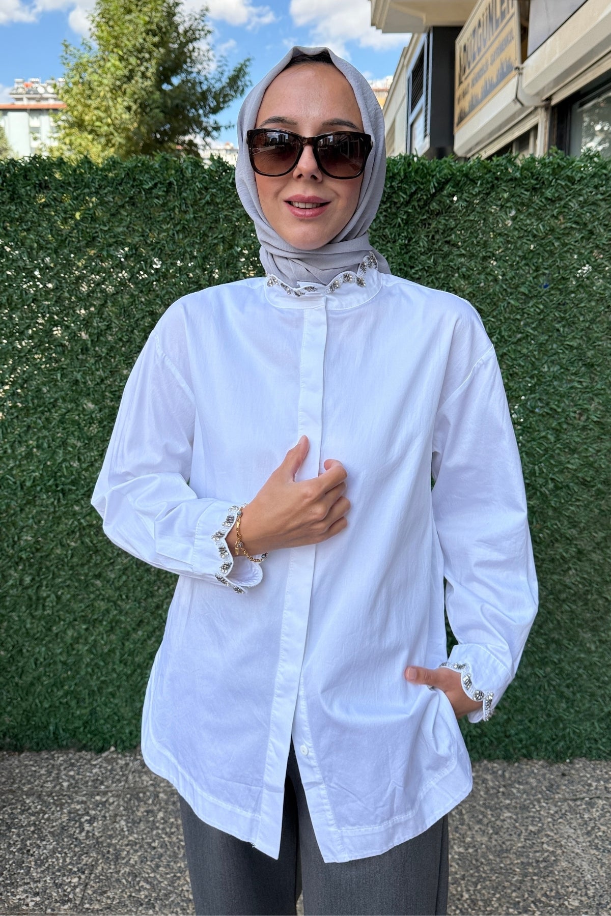 Zarif taş detaylarıyla modern bir görünüm sunan bu beyaz gömlek, sade şıklığı sevenler için ideal bir parça. Rahat kalıbı ve kaliteli kumaşıyla gün boyu konfor sağlar. Ofis kombinlerinden günlük stillere kadar kolayca uyum sağlar.