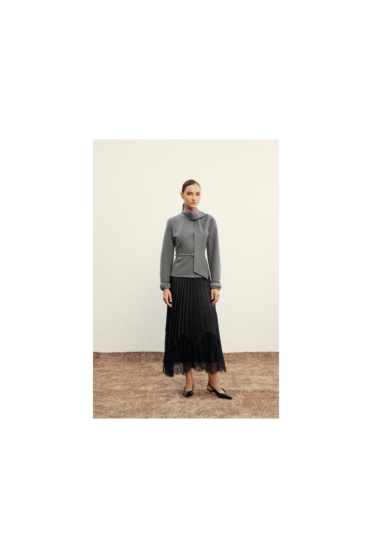 Romantik dokunuşları modern zarafetle buluşturan Venöve Lero Etek, pileli kumaşı ve dantel uç detayıyla dikkat çeker. Akıcı yapısı sayesinde feminen bir siluet sunarken, Willy Ceket ile kusursuz bir takım oluşturur. Günlük kombinlerde topuklu ayakkabılarla ya da özel davetlerde zarif bluzlarla tamamlanabilir.