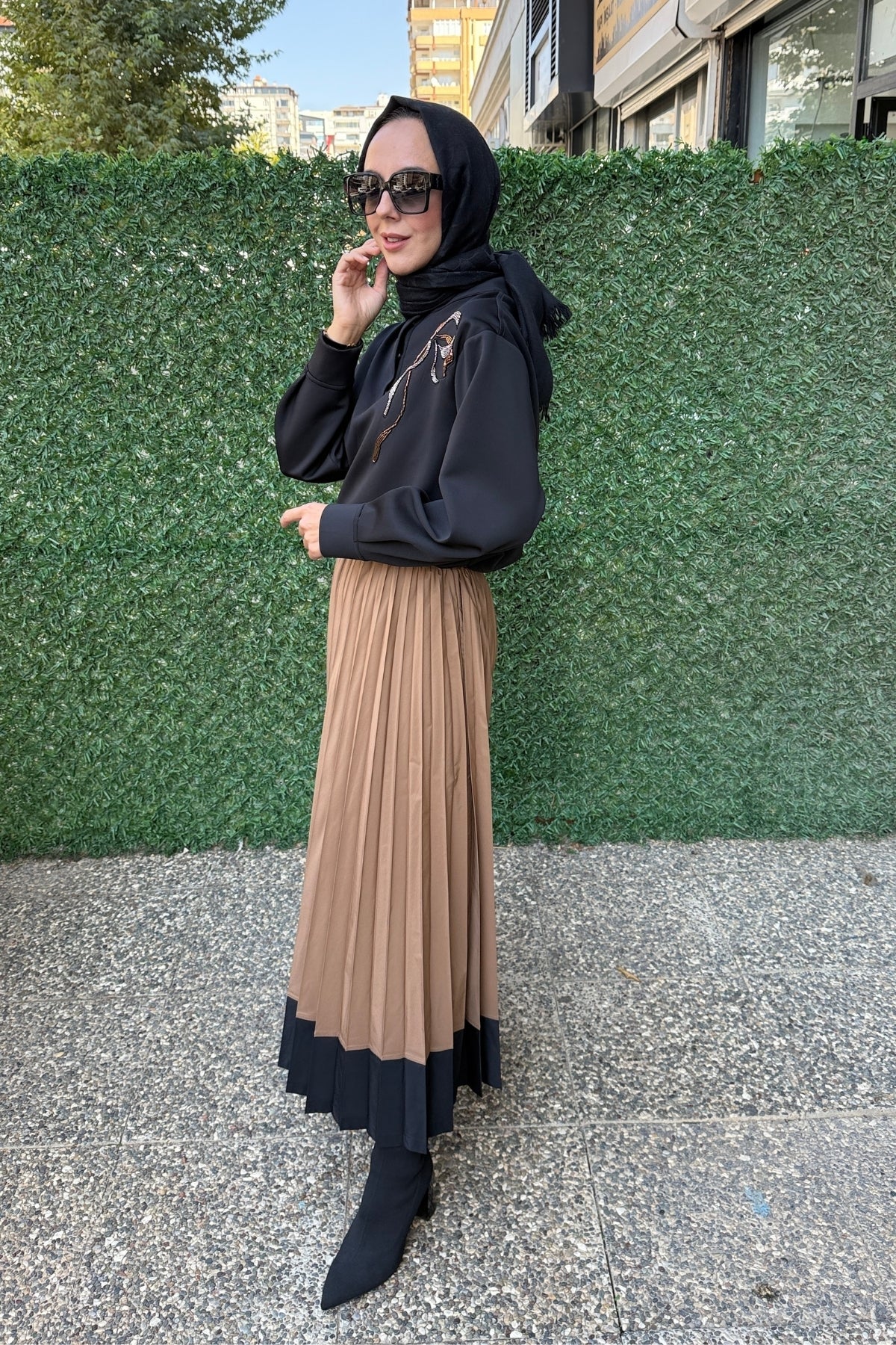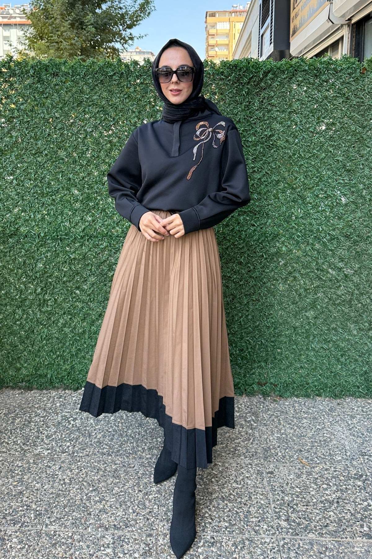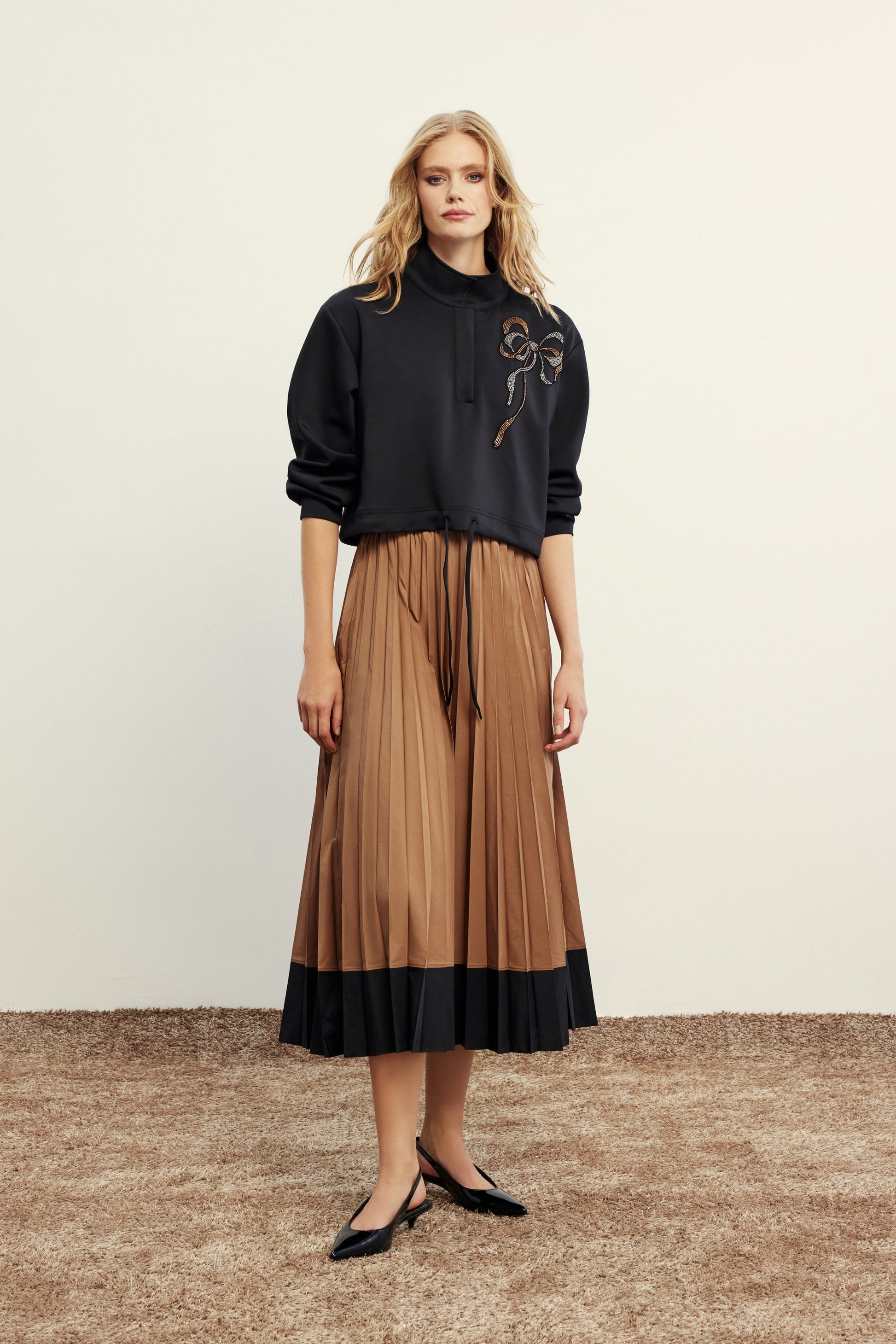 Mira Elbise, modern çizgileri ve rahat formu bir araya getiren şık bir tasarıma sahiptir. Üst kısmı nakış detaylı, yarım balıkçı yaka ve ayarlanabilir büzgülü bel detayı ile sportif bir görünüm sunar. Alt kısmındaki pliseli etek ise hareketli yapısıyla dinamizm katarken, iki tonlu renk geçişi elbiseye karakter kazandırır. Hem günlük hem de şehir şıklığına alternatif olarak öne çıkar.