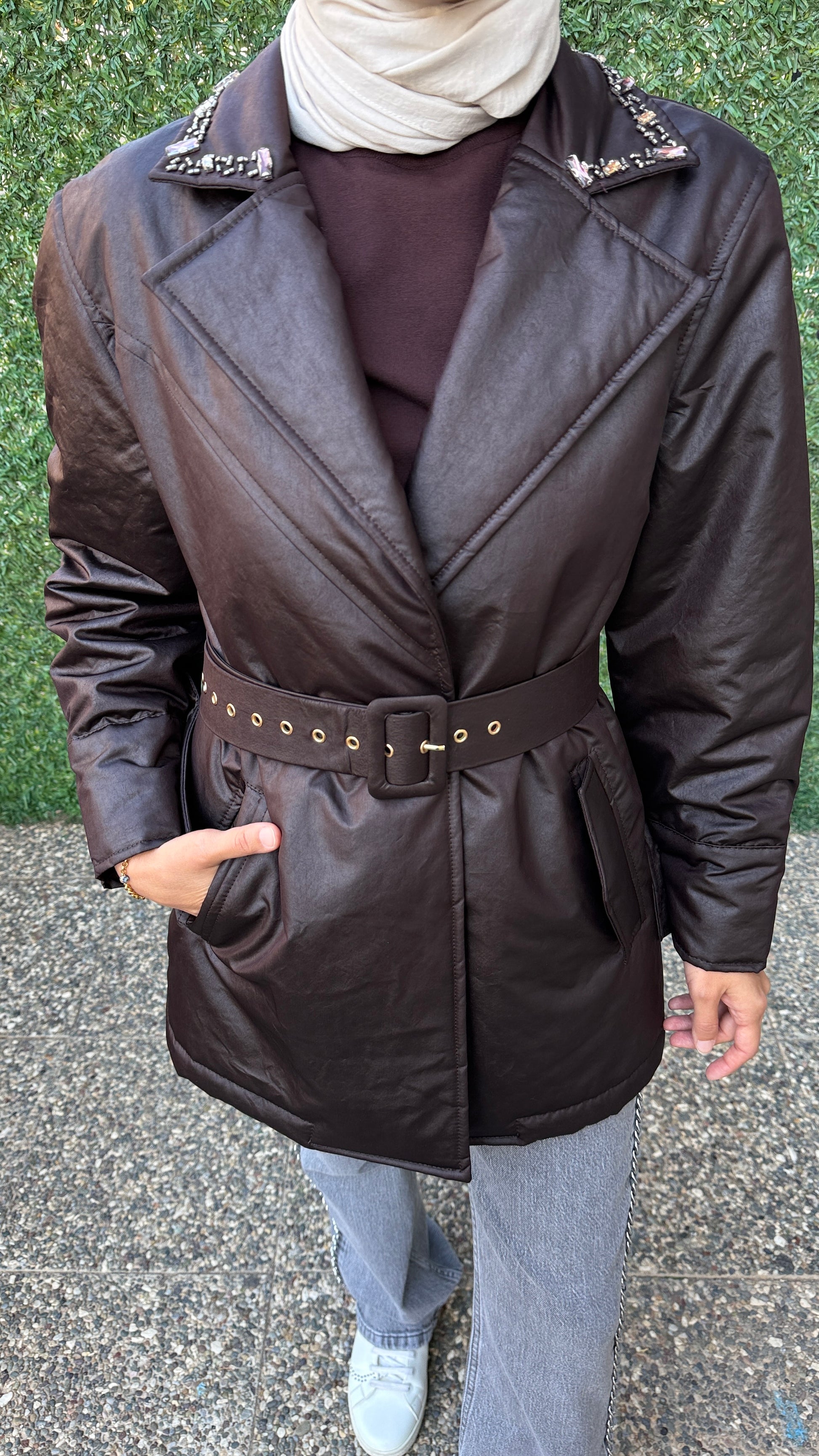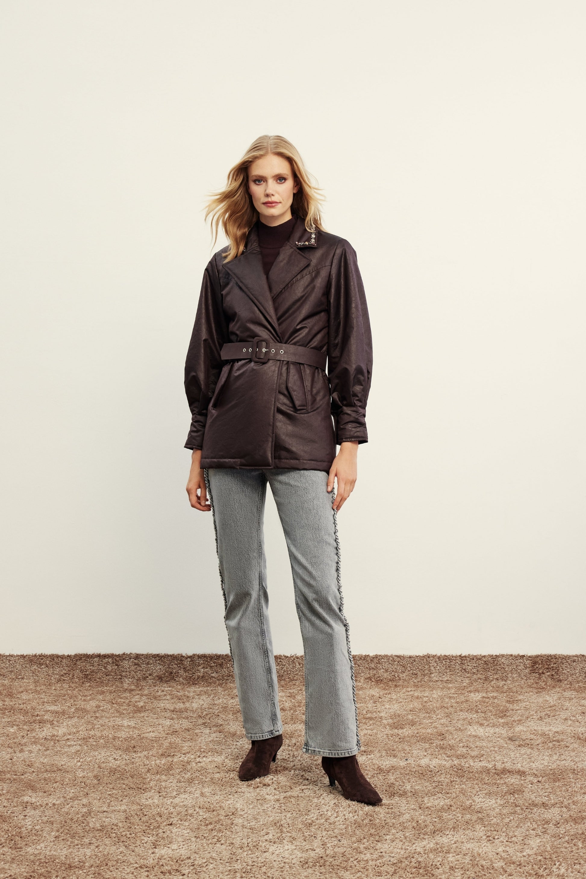 Nils Ceket, şehirli stilin vazgeçilmez parçalarından biri. Parlak dokulu özel kumaşı ve bele oturan kemer detayıyla günün her anında şık bir görünüm sunar. Rahat kesimi sayesinde hem ofis şıklığında hem de günlük kombinlerde kolayca kullanılabilir.